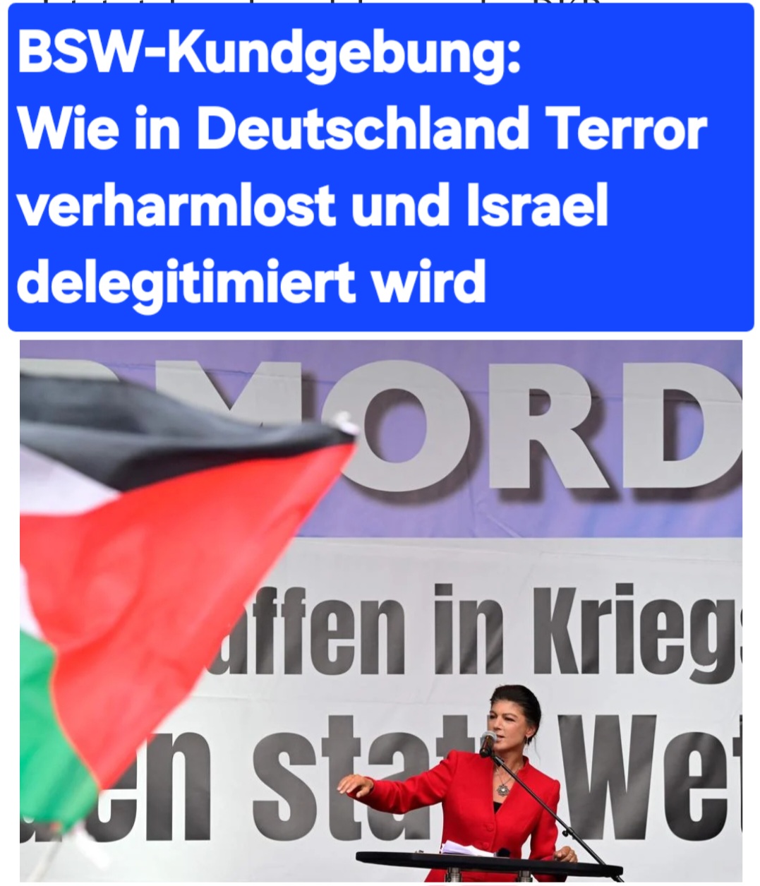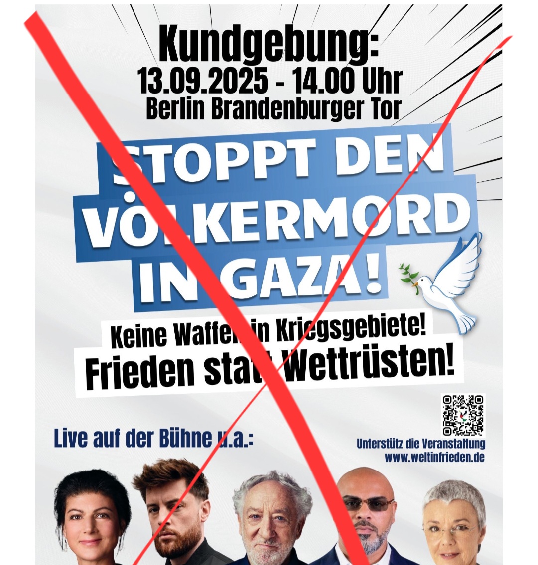 Die BSW-Kundgebung, angeblich für Gaza, stärkt faktisch das Mullah-Regime, die Hamas und die deutsche Querfront. Sie verschweigt das Oktoberpogrom und der Geiselnahme der Hamas und schwächt Israels Verteidigungsfähigkeit gegen Terror und fordert Diplomatie ausschließlich über die Täter – Khamenei, Hamas und Putin –, was faktisch Appeasement legitimiert und die Opfer marginalisiert. Die BSW-Demonstration muss storniert werden.
