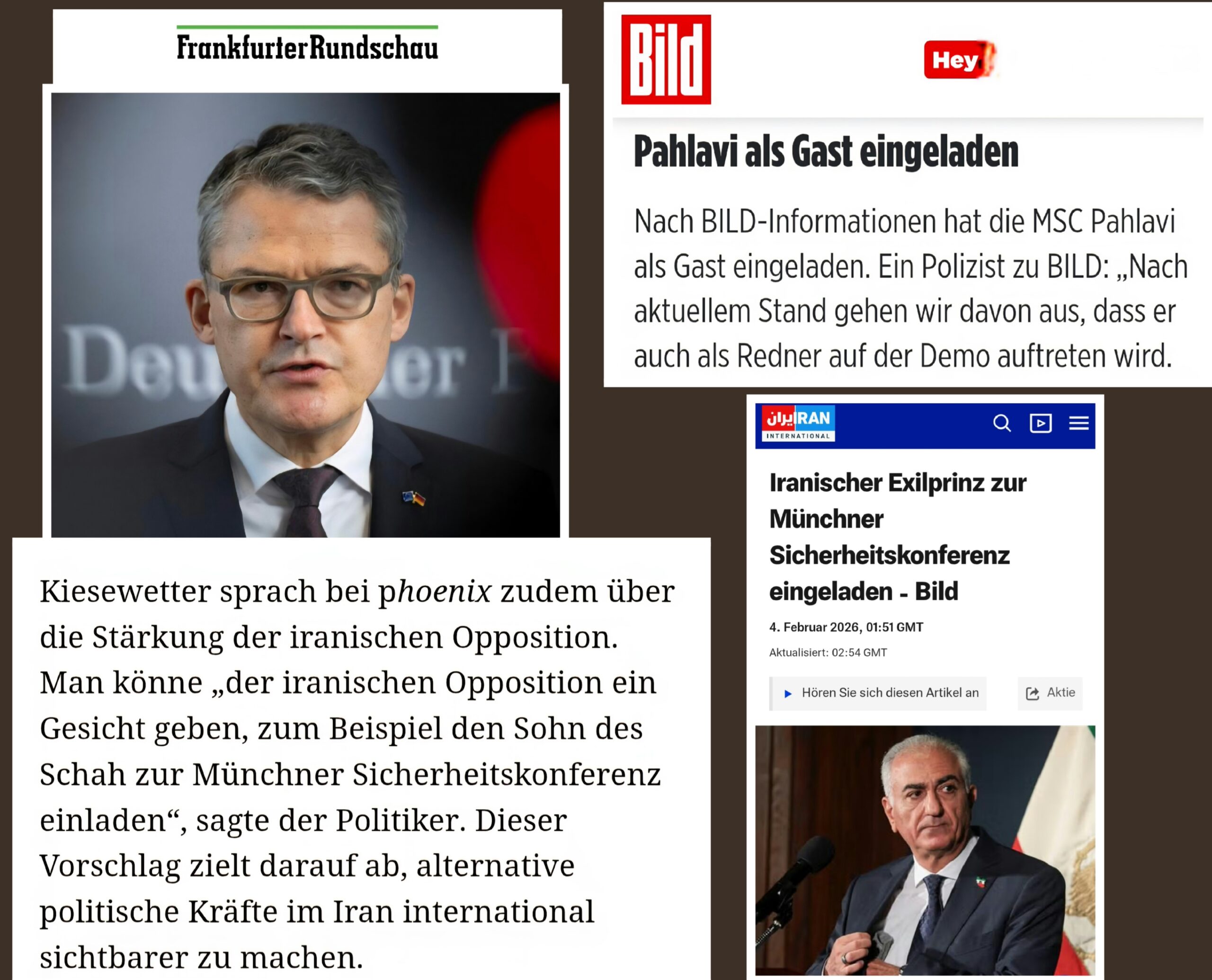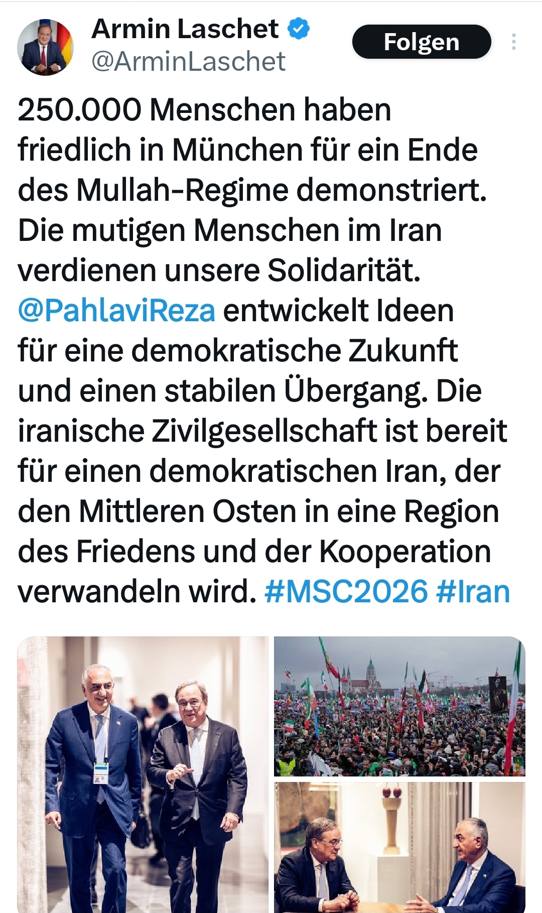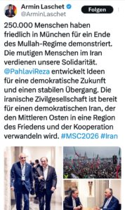 Schließlich zeigt sich die internationale Dimension der Exil-Mobilisierung: Am 15.02.2026 traf sich Armin Laschet, Vorsitzender des Auswärtigen Ausschusses, mit Reza Pahlavi. In einem öffentlichen Tweet würdigte er die Demonstration von 250.000 Menschen in München und bezeichnete Pahlavi als Ideengeber für einen demokratischen Übergang – eine gewisse diplomatische Aufwertung, jedoch keine offizielle Anerkennung als politische Alternative.