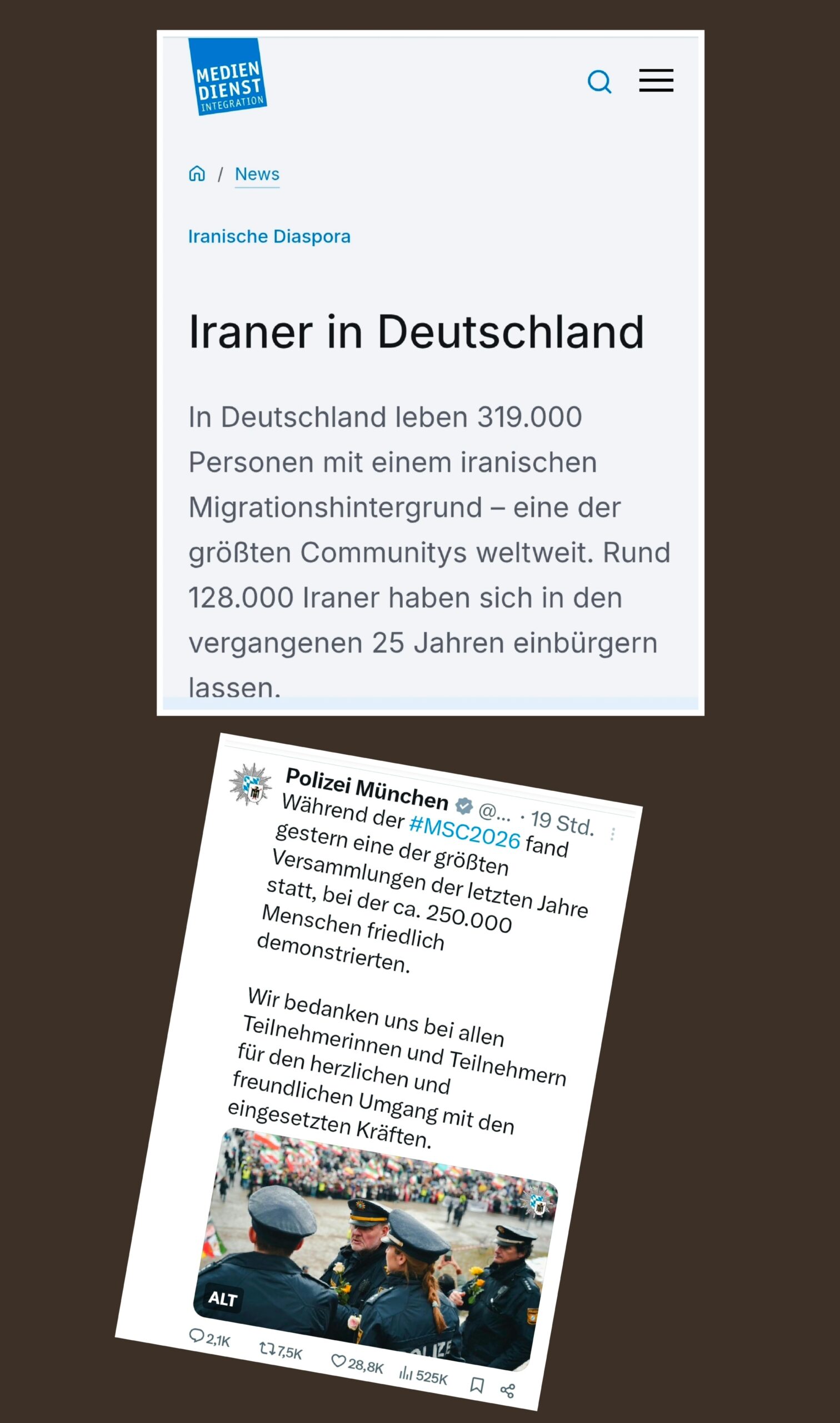 Gleichzeitig stellen diese Unterstützer:innen nicht die Mehrheit der rund 95 Millionen Iraner:innen dar, davon leben rund 10 Millionen im Ausland. Allein in Deutschland beträgt die Zahl der Iraner:innen in 2025 offiziell rund 319000. Laut Angabe der Münchener Polizei betrug die Teilnehmer:innen der Pahlavi-Demonstration rund 250000.