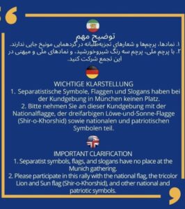 Die Organisatoren der Kundgebung @munichcircle kündigten zuvor an: „Separatistische Symbole, Flaggen und Slogans haben bei der Kundgebung in München keinen Platz. Bitte nehmen Sie an dieser Kundgebung mit der Nationalflagge, der dreifarbigen Löwe-und-Sonne-Flagge (Shir-o-Khorshid) sowie mit nationalen und patriotischen Symbolen teil.“